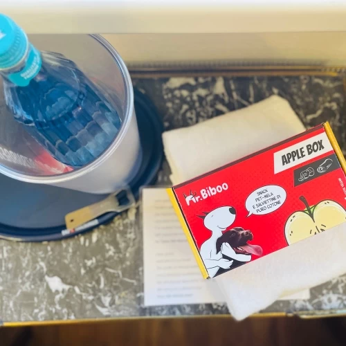Una fantastica box contenente : 1 busta di Snacks di mele disidratate biologiche del Trentino Alt o Adige, m per cani 2 salviette in puro cotone 1 rotolo di poop bag Se hai una struttura Pet friendly e sei interessato ad una collaborazione contattaci subito e saremo lieti di offrire i nostri prodotti per rendere unica l'esperienza dei vostri amati clienti.